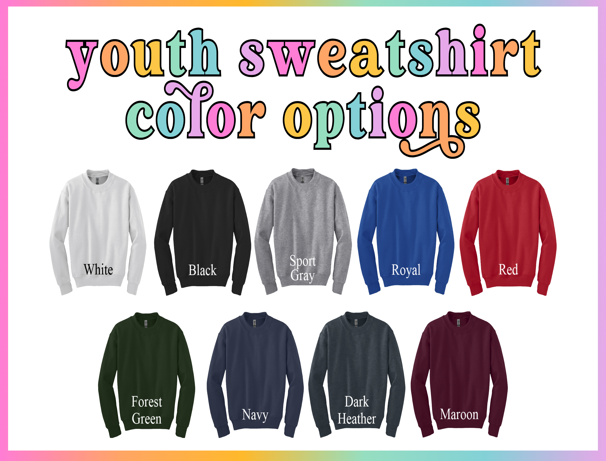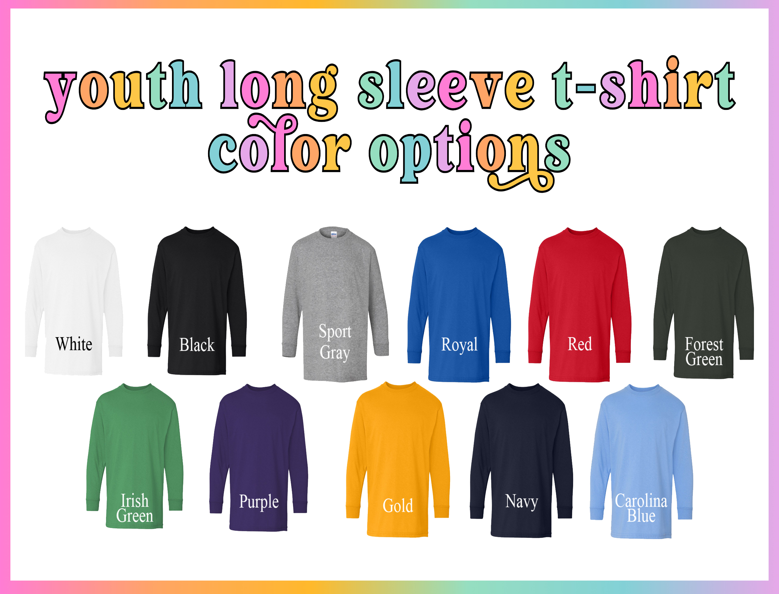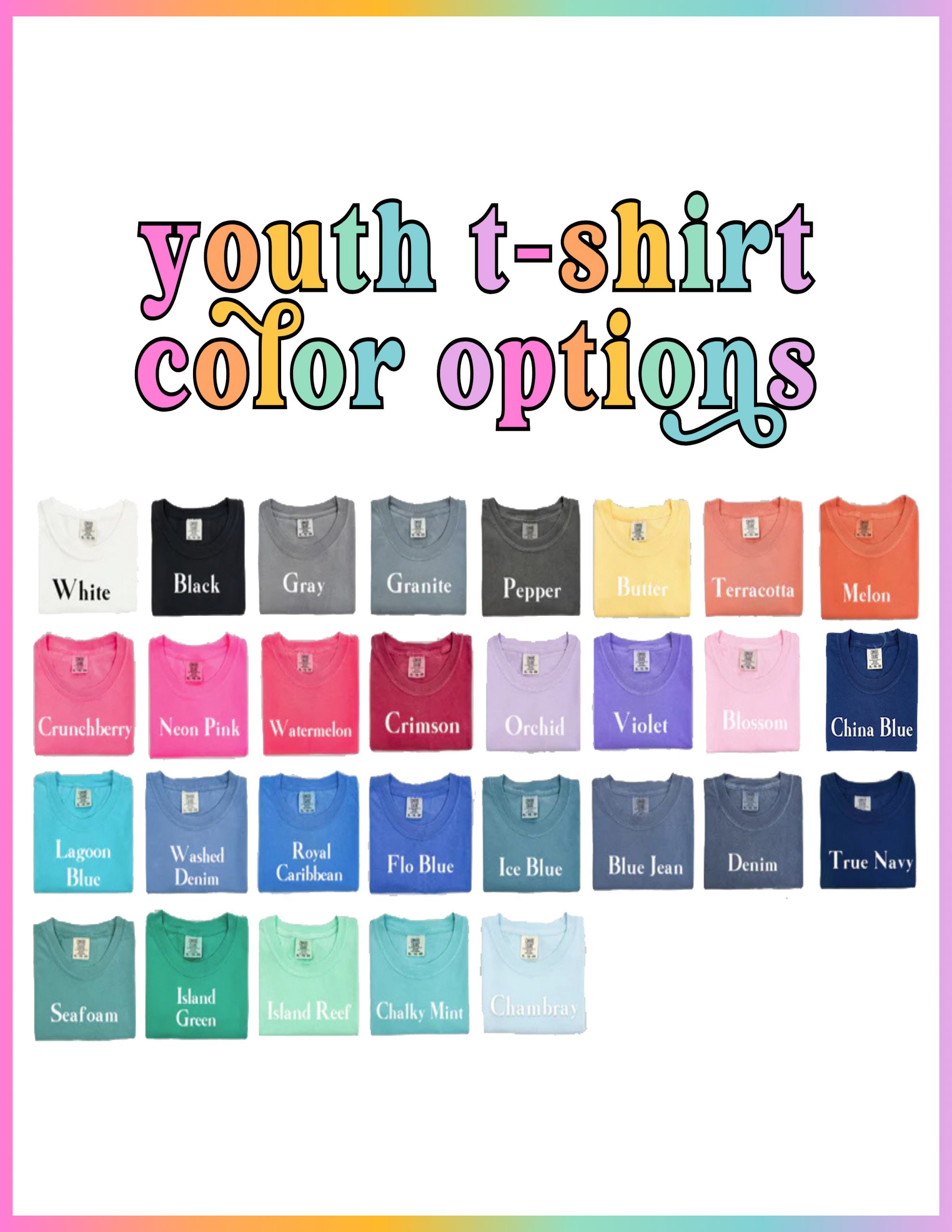 White, Black, Gray, Granite, Pepper, Butter, Melon, Terracotta, Blossom, Watermelon, Neon Pink, Crunchberry, Crimson, Island Reef, Seafoam, Chalky Mint, Island Green, Grass, Washed Denim, Denim, Chambray, Ice Blue, Flo Blue, Lagoon Blue, China Blue, Blue Jean, Royal Caribbean, True Navy, Orchid, Violet, Boysenberry